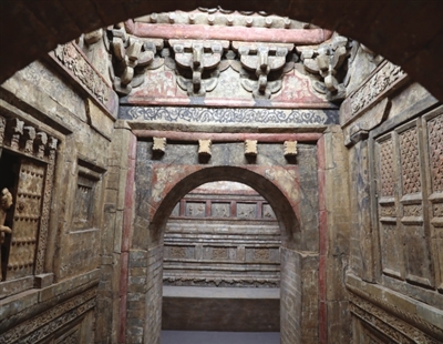 郝匠金墓位于晋城市经济开发区郝匠社区怡凤小区东部,墓葬结构保存完整,可分为墓道、墓门、前室、甬道、后室五部分。该墓仿木建筑砖雕和建筑彩绘保存完好,砖雕图像包括仿木构建筑构件、格子门窗、二十四孝等,建造精美、题材多样、内容丰富。此次展览中硕大的墓葬以裸展的形式呈现,800多年前的墓葬被整体“搬进”展厅。