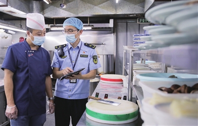 暑期,餐饮消费进入旺季。7月11日,迎泽区庙前街道办事处对辖区餐饮企业进行食品安全检查。此次检查主要针对后厨卫生、食材来源等。图为庙前街道行政综合执法队对餐饮企业后厨进行卫生检查。 王韵菲 摄