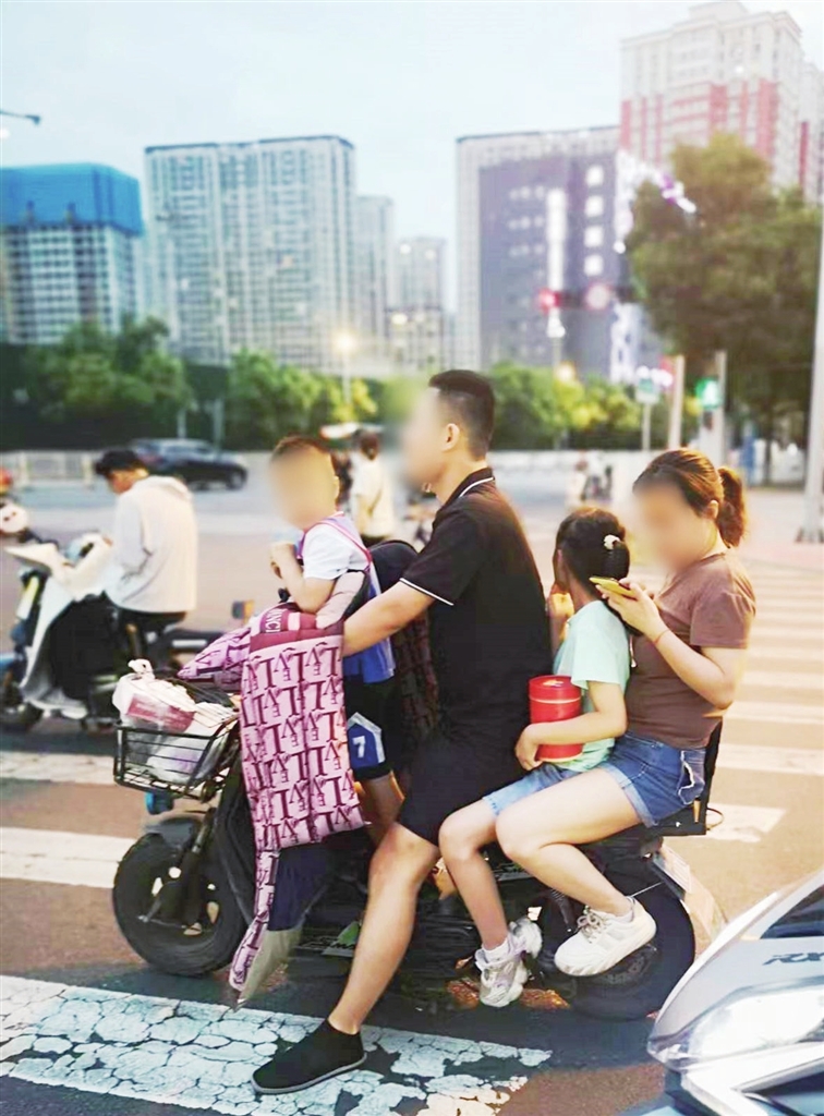 拍摄经过:7月9日晚,长风西街晋祠路口东向西方向非机动车道上,一名男子骑着电动自行车载着妻子儿女,不但超载,还未戴头盔,看着十分危险。希望大家出行时遵守交通法规,勿贪图一时便利,酿成无法挽回的后果。