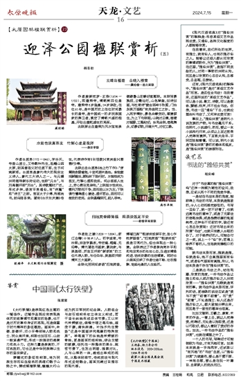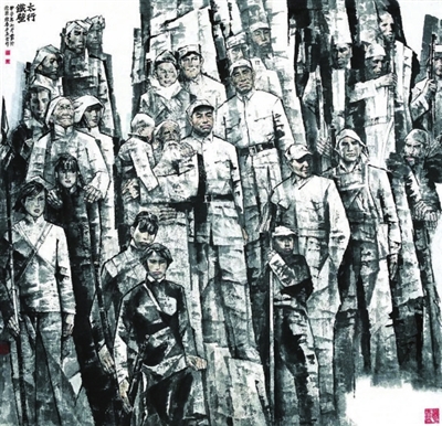 群雕式的象征性构图,将为民族生存而浴血奋战的英雄们融于山势之中,铸成铜墙铁壁,巍巍太行山成为抗日军民的纪念碑。人物组合与岩石结构吸收立体主义构成,若干竖长斜线形成总体节奏;又以宋代斧劈皴法,侧锋方硬之笔勾线,湿泼干擦,痛快淋漓。叶浅予先生赞扬“这是中国画讲究笔墨的特殊效果”。举笔直下的纵线是斧劈皴的骨线,更是画面的结构线,综合交错的皴擦,依托在一种整体的黑白、疏密节奏下,生发出明暗、强弱对比,人与山浑然一体,凝结出单纯的视向,从整体到细节,传统技法与现代形式妥帖融合,画面充满过目难忘的现代感。