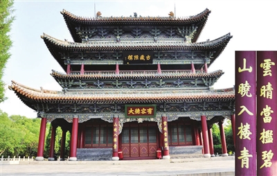 此联原出自康熙为风水宝地承德避暑山庄静好堂题联。本联写景瑰丽,云霞灿烂,山色翠幽,如诗如画,与杜甫诗“窗含西岭千秋雪,门泊东吴万里船”有异曲同工之妙。当、入两字精妙,景色由静变动,意境顿生,为上下句联眼;山晓对云晴,楼青对槛碧,工整贴切。纵观全联,落笔隽永,切景切物,开阔大气,对仗工稳。