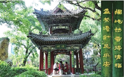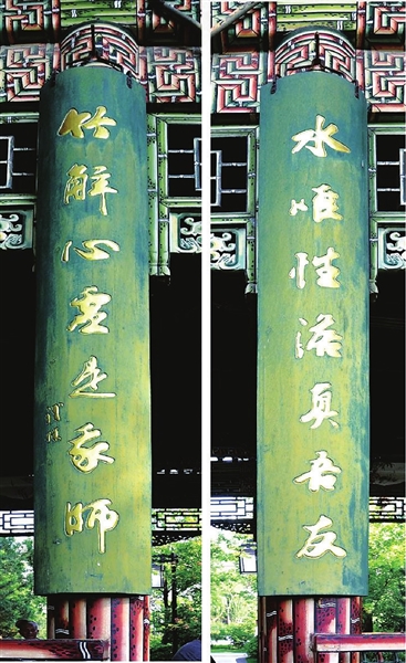 此联出自白居易《池上竹下作》:“穿篱绕舍碧逶迤,十亩闲居半是池。食饱窗间新睡后,脚轻林下独行时。水能性淡为吾友,竹解心虚即我师。何必悠悠人世上,劳心费目觅亲知。”上联指水性淡泊,善利万物而不争,因而我以水为友;下联谓竹懂得虚心谦逊、虚怀若谷,因而可以做我的老师。全联蕴藉深沉,耐人寻味。