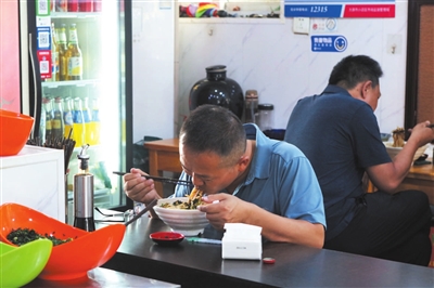 “老板娘,来碗打卤面。”一位背着公文包的小伙,进店后说道。“哦,晓得了,面硬过凉。”王东妻子静姐直接报出了小伙的口味习惯。实际上,静姐记得很多顾客的口味习惯,她甚至还知道,这位小伙的家就在附近,小店陪伴他从学生时代走入工作时代。几分钟后,小伙一边大口吃面一边告诉记者:“来吃面不光是因为好吃,还因为这里亲切、自在,像在家里吃妈妈做的面一样。”午饭过后,小店暂时恢复宁静。店堂里,静姐带着帮工剥蒜、择葱;炉灶前,王东守着滋滋冒着香气的炖锅。到了如今,不管再累,夫妇俩似乎总能保持这样的状态:乐观、积极、勤劳。因为,一碗面,大有乾坤,热乎了生活,彰显了心灵深处的慰藉……