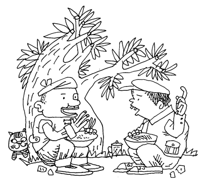 圪蹴成了老太原地区特别是乡村的一道风景,更是一幅幅乡村画。人们在田间地头圪蹴着,估摸着庄稼的收成;在坡上圪蹴着放牛,看着牛津津有味地吃草;在屋里的地上圪蹴着,谋划着儿女的婚姻大事;在邻居家里圪蹴着,交流着致富门路;甚至村里开会圪蹴着,看电影看戏圪蹴着,就连走亲戚也是炕沿不坐圪蹴着。而圪蹴不误事的最好时候就是吃饭时,大人小孩端着大海碗,家门口、村委会及供销社门前一圪蹴,这就是老太原人昔日的村头“饭场”——众人圪蹴着,大口吃着,大声说着,开怀笑着。圪蹴着吃饭,据说从养生角度来看,有一定的科学道理,老太原人的一句俗话“圪蹴下吃饱,站起来正好”便印证了这一点。