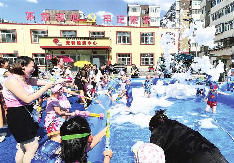 活动当天,天气虽热,孩子们的热情丝毫不减。小花园内早早布置好了充气泳池和泡泡机。五颜六色的泡泡在空中飞舞,仿佛将孩子们带入梦幻的童话世界。孩子们身着清凉泳衣,手持水枪和泡泡棒,在水中嬉戏玩耍。他们的笑声和欢呼声回荡在辖区,引来不少居民驻足围观。有的孩子追逐着五彩斑斓的泡泡,有的孩子与小伙伴们展开激烈的水枪大战,尽情释放着活力。
