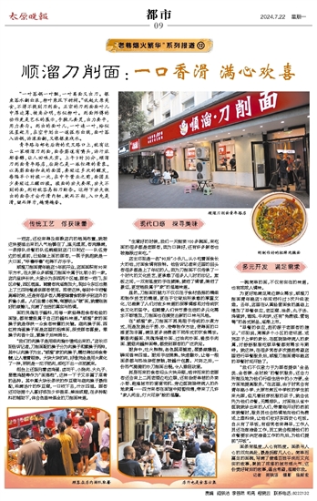 店主邓阳是一名“90后”小伙儿,从小吃着面食长大的他,对面食情有独钟。他告诉记者来这里的回头客很多都是上了年纪的人,因为刀削面不仅传承了一个时代的文化技艺,更承载了很多人儿时的印记。案板之间,一双有温度的手在揉擀,揉进了情愫,擀进了豪迈,更定格独属于“家”的温暖味道。