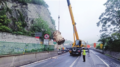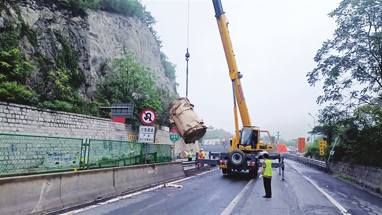 路网运行保障三队接警后,第一时间赶赴现场进行布控布防,并积极协调吊车和转运车辆、人员迅速到场清理。工作人员一方面配合高速交警在来车方向进行远端管控,一方面指挥救援力量将纸筒先行吊装至路侧及时打通车辆放行通道,快速放行滞留车辆。经过紧张有序的处置,散落路面的纸筒全部安全装车并运离高速,险情排除,现场恢复正常通行。