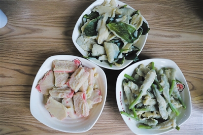店中的沾片子包含9种:玉谷叶沾片子、三七叶沾片子、菠菜沾片子、豆角沾片子、茄子沾片子、土豆沾片子、莲菜沾片子、白菜沾片子、午餐肉沾片子。对于沾片子,面和叶子这些主要材料极为重要。为了选用最好的食材,做出最地道的美食,给顾客最好的享受,除了其他七类食材在超市或菜市场购买以外,玉谷叶子、三七叶子这两种比较特殊的食材,李建鹏坚持每天现采。