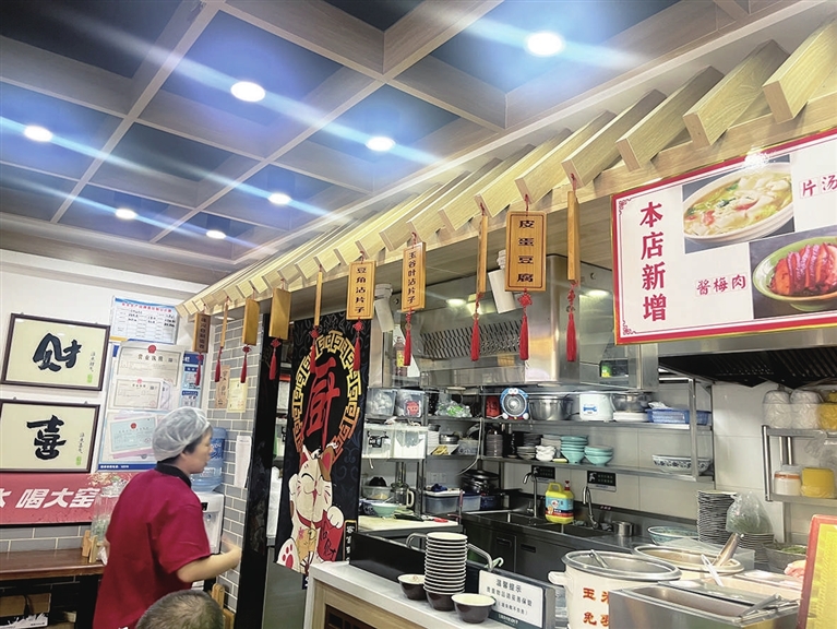 “我还要上次那个玉谷叶沾片子,两份。”“三七、蔬菜、豆角的沾片子各一份,还要皮蛋拌豆腐、狮子头。”……店中涉及凉调类、卤肉类、沾片子类、主食类、汤类、时令类、油炸类、酒水类等多种食品,来的大部分是回头客,报起菜名如数家珍。
