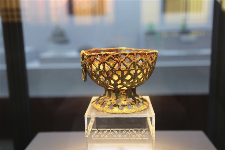 走入正殿的古代礼器展厅,黄色鸠杖在灯光下闪着光芒,这是博物馆的“镇馆之宝”。鸠杖又名王杖,是汉代朝廷为老人特制的一种拐杖。这根鸠杖长约2米,杖头顶端为一只鸠鸟。鸠鸟是古代的“不噎之鸟”,汉代朝廷以此来表达对老人身体健康的良好祝愿。商代玉环、唐代银鎏金九梁冠……种类繁多的礼器令人目不暇接。