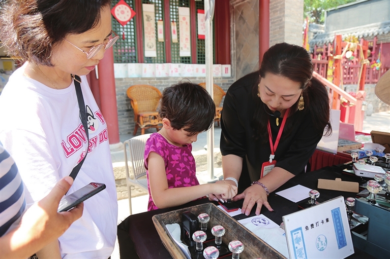 10枚清代十喜朱砂印章大小、粗细不同,喜字图案也各有特点。来自美国的安琪小朋友拿起印章,重重地蘸取印泥,再按压在打卡本上。“太好玩了!”第一次亲手盖章,体验中华文化,安琪特别兴奋,又去尝试旁边的非遗项目雕版画拓印。
