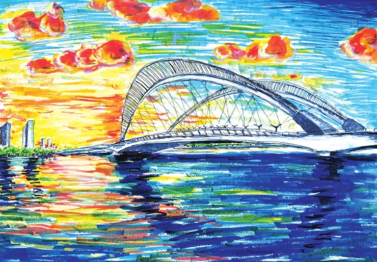 落霞中的南中环桥 三年二班 张曦月 绘