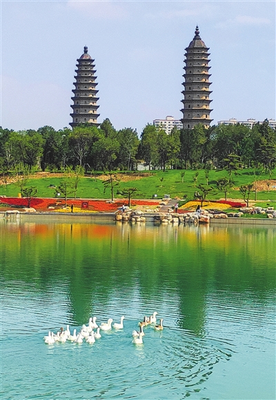 围绕双塔从北到南带状的湖水,设计很精妙,从北、西、南的外湖岸看巍峨高耸的双塔倒映在湖水中,连同周围的景色,形成了独有的风景,双塔凌霄不仅巍峨壮观,而且婀娜秀美,遇上蓝天白云的日子,此情此景真让人“眼前有景道不得”,不是言语所能表达得了的。
