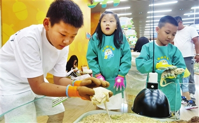 暑假期间,我市大型商场举办各种主题活动吸引小朋友,促进消费。图为7月25日,吾悦广场“萌宠乐园”里,小朋友与新奇宠物近距离接触。 刘敏 摄