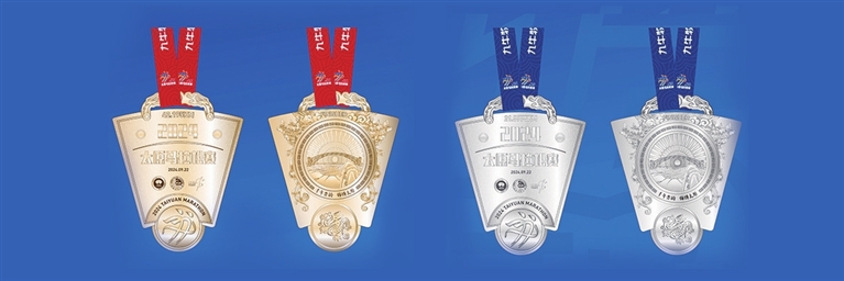 在全程、半程两款完赛奖牌上,又以古晋阳八景之一的“汾河晚渡”为主创意,结合晋祠水镜台“圆形窗户”、山西古建筑屋檐、城市新地标“晋阳桥”等元素,令太原的千年历史和现代成就跃然眼前。