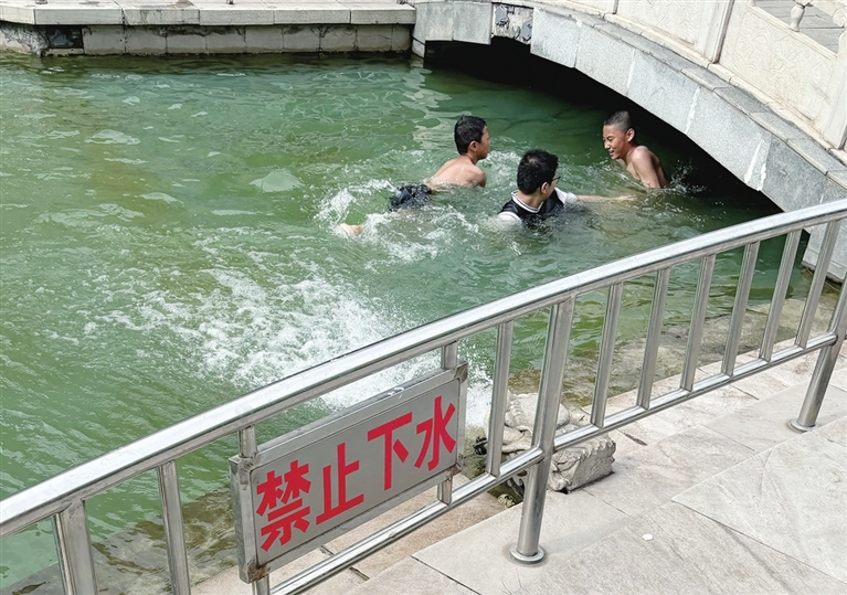 7月29日,五龙口街一处游园内,孩子们不顾“禁止下水”的警告,在池塘内戏水打闹,存在安全隐患。