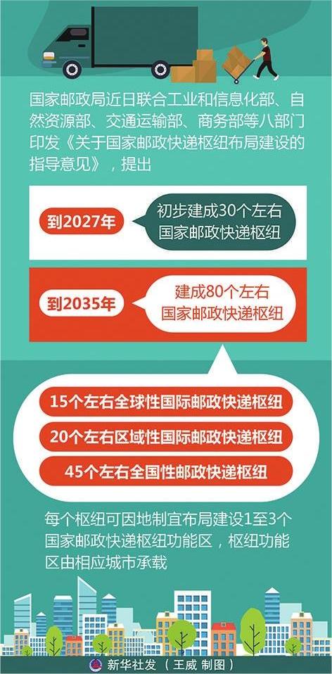 据新华社北京7月29日电(记者戴小河)国家邮政局近日联合工业和信息化部、自然资源部、交通运输部、商务部等八部门印发《关于国家邮政快递枢纽布局建设的指导意见》,提出到2027年初步建成30个左右国家邮政快递枢纽,在全国形成示范带动作用;到2035年建成80个左右国家邮政快递枢纽,形成布局合理、功能完备、智慧高效、绿色安全的国家邮政快递枢纽网络。