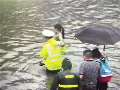 交警杏花岭大队辖区内,新建路柳溪街口至府西街段和胜利街新建路至解放路段积水较为严重,特别是新建路的积水路段,有四五辆轿车被困。针对这种情况,杏花岭大队安排交警加强巡逻,以便及时发现被困车辆。上午9时30分许,交警发现新建路有一辆轿车被困在积水中,被困人员中还有一个小女孩,于是立即冲入积水中,将女孩转移至安全地带。
