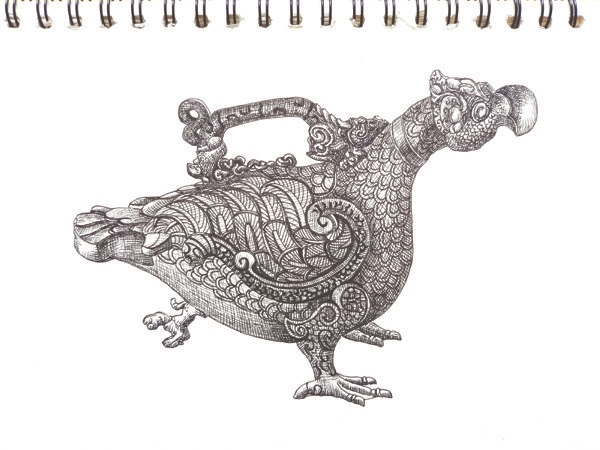 在众多青铜器中,高25.3厘米、长33厘米的“赵卿鸟尊”是当之无愧的明星。鸟尊的整体造型是一只目光炯炯、威武有神的猛禽鸷鸟。与晋侯鸟尊不同的是,它有出酒孔,是可用于日常生活的酒器。在鸟的背脊上铸有一只身体被拉长的老虎形象的提梁,如果提起,逐渐倾斜,鸟喙做成的流口就会随着重力慢慢打开,酒液也会缓缓流出。鸷鸟通体浮雕羽翼,羽纹华丽清晰。鸷鸟的双足做成了带有蹼的鸭掌形状,两只肥大的脚掌稳稳地托住了鸟尊的身躯。您仔细观察就会发现,在鸟尊的尾部,还有一只小小的老虎,它前爪刨地,后足跃起,牢牢撑住了鸟尊身体后部的重量。这样,即便在鸟尊中注满酒液,鸟尊也不会倾斜。它是晋国晚期青铜器的杰出代表,也是象征赵卿生前勃勃雄心、赫赫武功的代表文物。