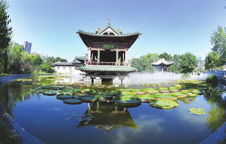 8月1日,迎泽公园泽众书院内,王莲正值盛放期,水雾弥漫时,站在飞虹桥和游廊上的游客宛如置身仙境。
