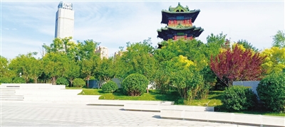 再说解放路街角节点,以上世纪80年代的大南门转盘为灵感,以“迎泽之环”为设计理念,采用圆环这个设计元素将四个街角地块融合为一个整体。同时依据四个街角不同的属性,形成不同的城市记忆,以环形缓缓展开。另外由于东南角迎泽阁位于制高点,街角设计时充分考虑该因素,采用台地空间,不仅解决了现场高差问题,而且把街角空间打开了,优美的林冠线更加烘托出迎泽阁的秀美,还增加了街角休憩空间,打造进得去、坐得下的绿地景观。