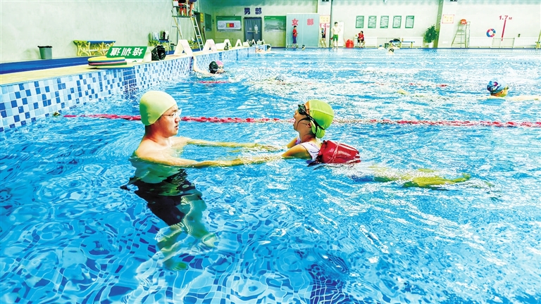 入伏以来,亲水项目成为不少市民游客消暑纳凉的首选,我市各个游泳场馆迎来客流小高峰。8月2日,太原市滨河体育中心游泳馆内,一名小学员正在教练的指导下学习。 平原 刘敏 摄影报道