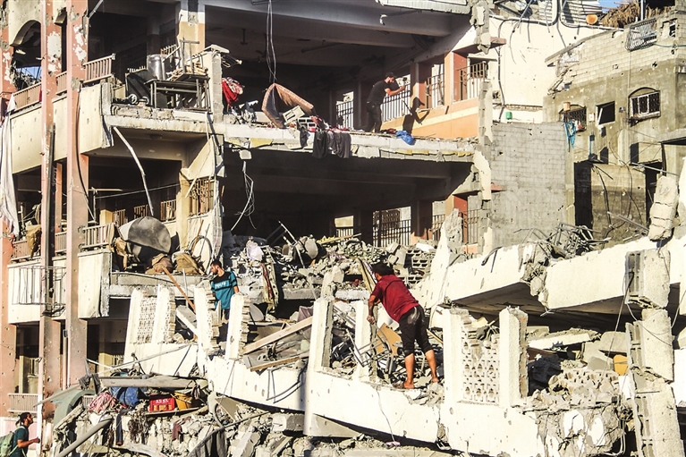 8月3日,在加沙地带北部加沙城谢赫·拉德万社区的哈马马学校,当地民众查看以军袭击后的废墟。新华社 发