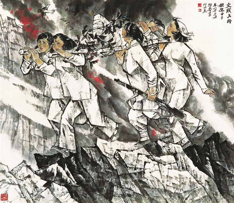 《火线上的姐妹》 杨力舟、王迎春合作 纸本设色 106×123cm 1984年