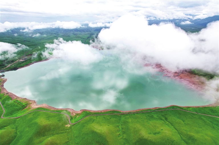 7月11日拍摄的云雾中的山丹马场鸾鸟湖(无人机照片)。