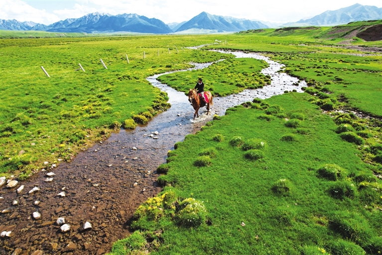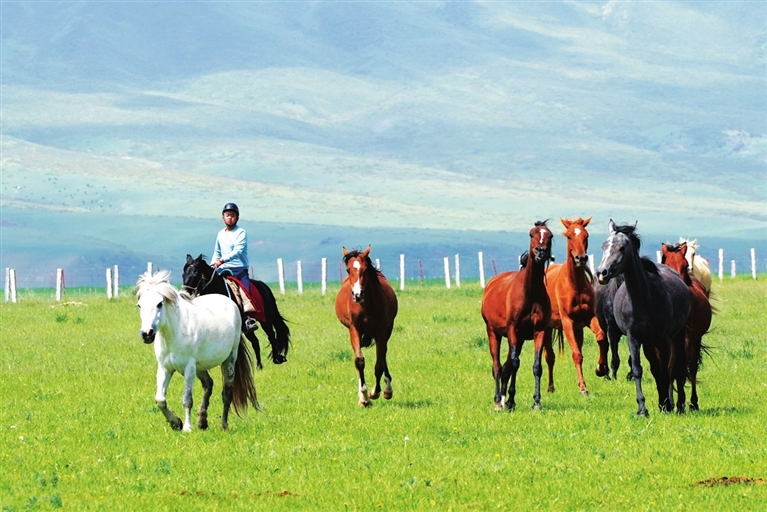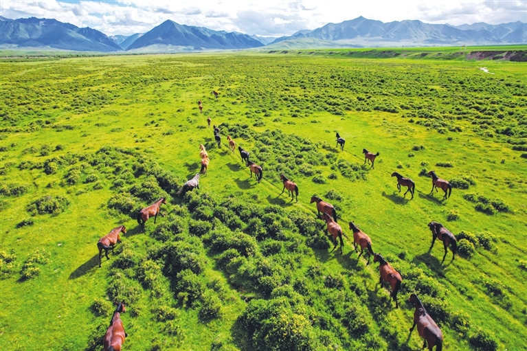 今天的山丹马场,成群的骏马在蓝天白云下驰骋,和连绵起伏的祁连山、一望无际的大草原,共同构成一幅生态和谐的美丽画卷。