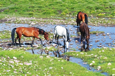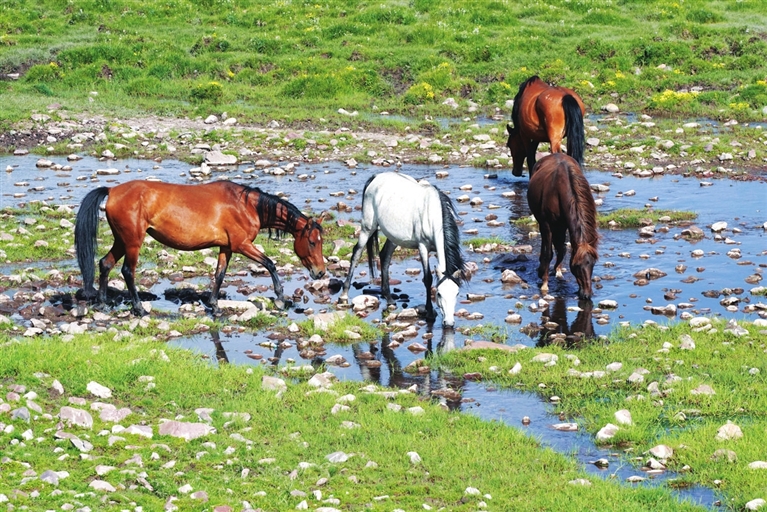7月10日,马群在山丹马场草原上的溪流旁饮水。