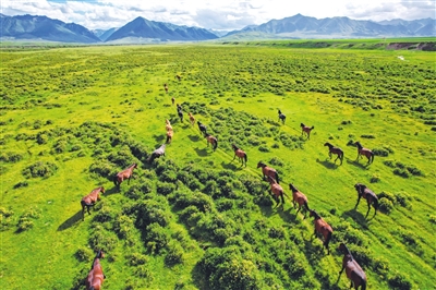 7月10日,马群在山丹马场草原上觅食(无人机照片)。