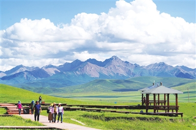 7月10日,游客在山丹马场鸾鸟湖畔游览赏景。