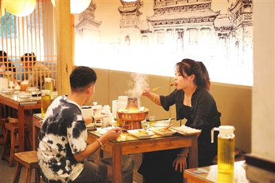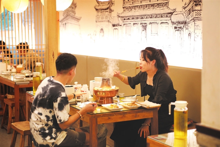 煮万物为食,品同宗美味。食客从头吃到尾,锅内总是一种沸腾状态,粉条滑溜爽口,豆腐醇香浓郁,酥肉软糯不腻……店员会适时添加汤底,锅内的菜、肉越煮越香,汤也越熬越好喝,舌尖被烫得麻酥酥的,胃里却暖暖的,这种层次丰富、口感细腻的独特风味抚慰着食客的胃肠和心灵。