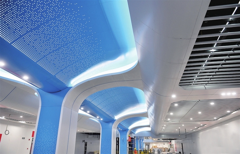目前,柳巷南口站4个出入口及1个安全口钢结构骨架已经全部完成,4个出入口屋面压型钢底板以及玻璃幕墙型材框已经全部完成,预计8月底该站所有出入口地面罩棚装修全部完成。