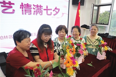 8月9日,万柏林区小井峪街道玉泽园社区开展“巧手花艺 情满七夕”主题插花活动。 张昊宇 左蓉 摄影报道