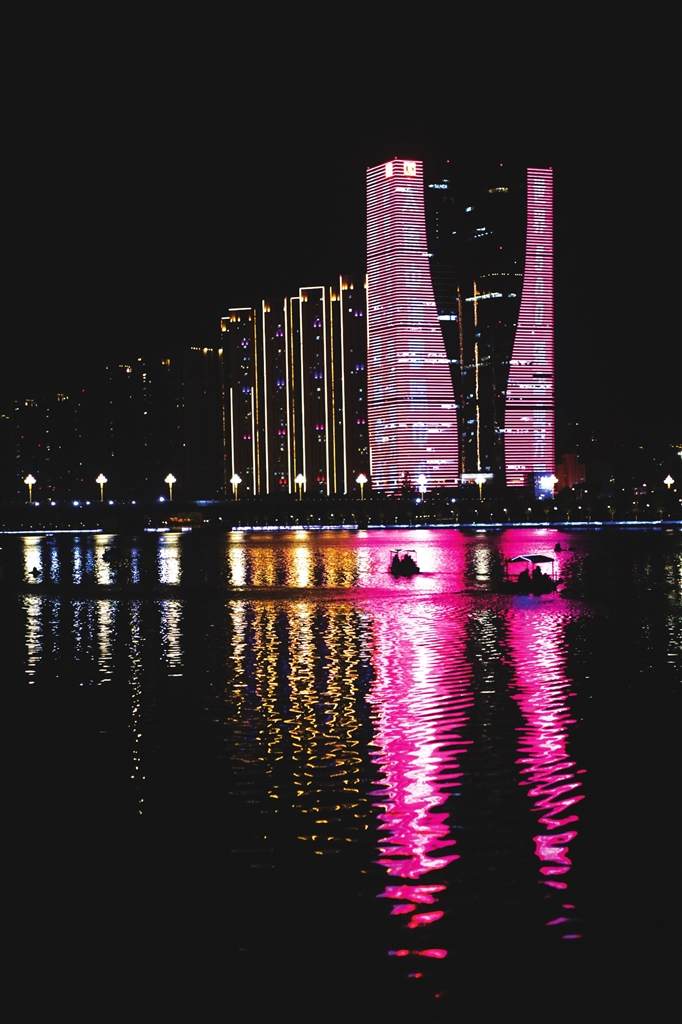 8月9日晚,雨后的太原空气清爽,楼宇灯光璀璨,汾河上轻舟游弋,融入美景。
