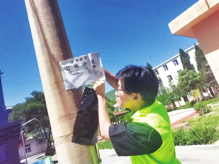 因为来的次数多,社区干部干脆让董景文当起了大学生志愿者服务队的队长。每周来社区参加志愿劳动的大学生,来自不同的学校,董景文都要提前联络协调对接、安排组织,然后分组。实际劳动中,他自己干得最多,不但要清扫路面上的垃圾杂物、渣土,还要对楼道、电线杆、小区宣传栏、楼栋墙面、单元门上的小广告进行全面清理,并协助网格员规劝路边的小商贩将摊点摆进划线的区域。