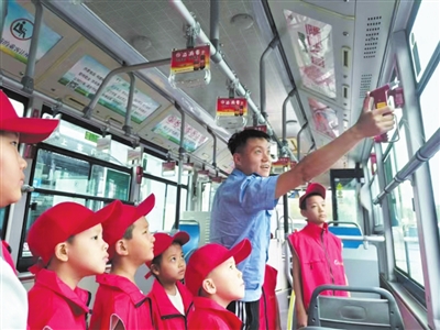 随后,檀振龙带领孩子们认识公交车的安全位置。他让孩子们进入驾驶室,分别从驾驶员的视角与行人视角对比分析,通过游戏的方式让孩子们认识到处于公交驾驶员视野盲区的危险性。“同学们,刚才大家坐在驾驶员的位置可以看到车周边的人吗?”大家都摇头表示看不到,檀振龙收起了笑容,严肃地说:“公交车车身较大,在车的前后、两侧有很大的盲区,坐在驾驶员的座位上是看不见的,所以我们平时一定要避开这些盲区,千万不要在公交车或其他车辆的前面及左右后视镜下方、车尾等盲区位置逗留。记住,生命只有一次!”