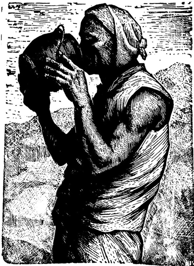 黑白木刻版画作品《饮》,是一幅描写陕北老乡日常生活的小品。画面中的老乡头戴白毛巾,白背心里面露出粗壮结实、皮肤黝黑的胳膊,骨节分明的双手捧着一瓦罐的凉水,大口畅饮,是一位朴素勤劳的劳动者姿态。整幅作品以纪念碑式构图,塑造人物侧面形象,并使面部五官隐于阴影,而以木刻三角刀细密的明暗调子突出刻画肌肉,使裸露皮肤的黑与着装的白形成强烈的对比,突出人物的力量感。背景中延安典型的远山与陕北典型的劳动者形象,形成如诗般的韵律,也折射出的中国劳动人民坚韧不拔的性格特征。1940年正处于抗日战争相持阶段,坚定的人民形象,象征着中国人民不可战胜的意志。