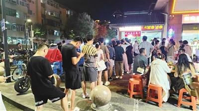 老军营小吃街一家人气小吃店吸引了众多市民游客前来打卡,大家自发排队等餐,秩序井然。 阎轶洁 赵静茹 摄影报道