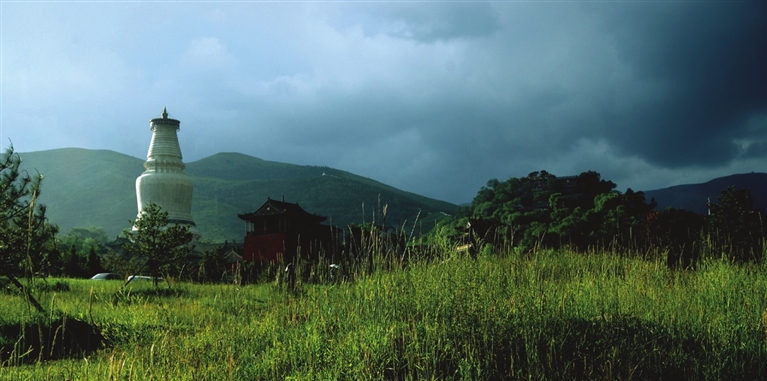 一次,在五台山拍摄,主景是白塔,但是白塔前面来往的游客众多,无法按下快门。此刻,突然电闪雷鸣,大雨点“噼里啪啦”从天而降,游人瞬间躲得无影无踪。我急忙用塑料袋套在相机上,前面掏了一个小洞,再放低机位让前面几辆汽车隐蔽在草堆后面。此时,我发现极好的画面出现了:阴云密布的背景下,一座白塔静静地矗立在油画般的背景前,没有一辆车,没有一位游客,极其安静、神秘,正是我想要的意境。