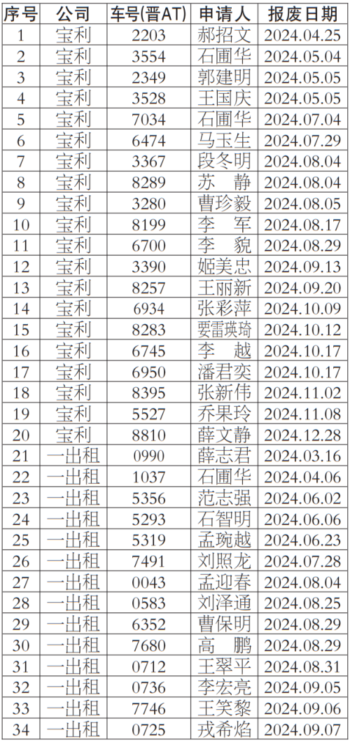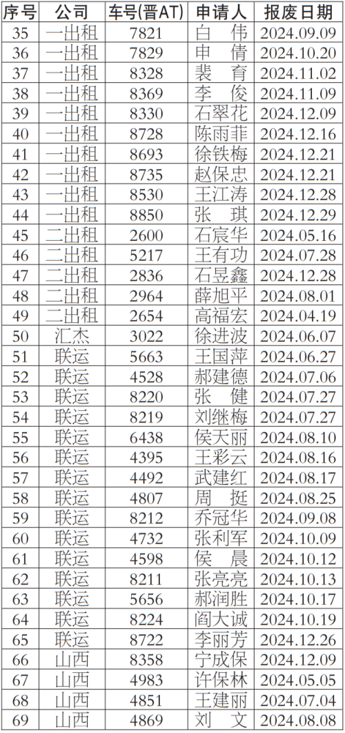 按照《太原市客运出租汽车服务管理条例》等有关规定,我公司对提出车辆更新申请的巡游出租汽车经营者申报材料进行了核实,现对符合条件的经营者名单69人予以公示,公示期为2024年8月16日——2024年8月20日,公示期间,若巡游出租汽车经营者及社会各界对上述车辆经营者资格有异议,均可来电反映。