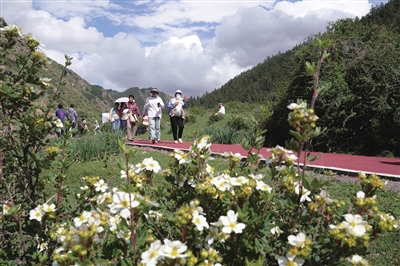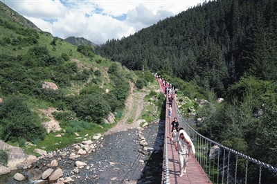 7月11日,游客在焉支山一处吊桥上赏景游玩。