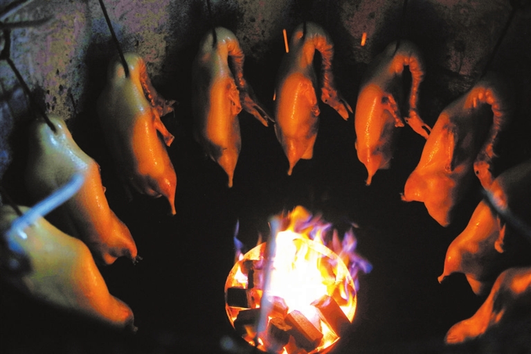 说话间他低头看了一眼时间,便赶紧将到点的烤鸭从热浪腾起的炉子中摘了出来。随着抖动,鸭子被烤出的热油间或落下,滴溅在炉底燃烧的炭火上,冒起阵阵诱人的“滋啦”声。