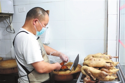 “几十年的老店了,我们家就认这一口。”熟客张大爷对十八烤鸭店的味道竖起了大拇指,“他们家的盐水鸭在太原,味道也没得说。”窗口除了挂起的烤鸭,还有堆摞起的盐水鸭。