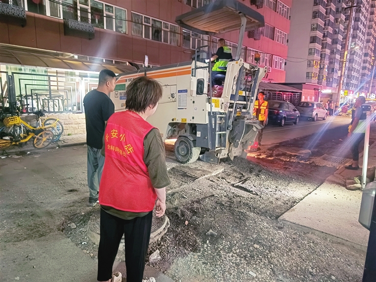 前阵子,市政部门对社区杨家堡南巷部分路段进行雨污分流管道施工。得知情况后,曹译丹及时和施工方负责人沟通,对方答应对坑洼路段进行修复。8月14日晚,路面修复工程开始,曹译丹和网格长一直守到次日凌晨,当铺沥青工程结束后,两人才放心离开。