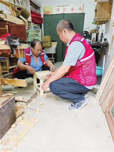 高水源(左)和张建彪制作“爱心睦邻凳”