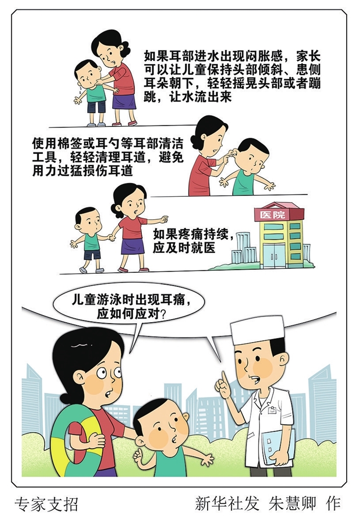 儿童游泳时出现耳痛,应如何应对?“如果耳部进水出现闷胀感,家长可以让儿童保持头部倾斜、患侧耳朵朝下,轻轻摇晃头部或者蹦跳,让水流出来;使用棉签或耳勺等耳部清洁工具,轻轻清理耳道,避免用力过猛损伤耳道。如果疼痛持续,应及时就医。”刘志建说。