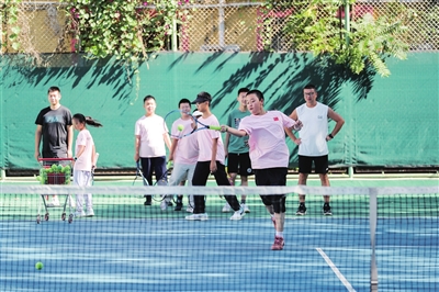 顺着王皎看向球场的视线,是“打球很有毅力”的16岁的张容淏和15岁的刘溢琛。他们正在上赛前集训课,两人对网球有着不同程度的喜爱。“我的生活离不开网球,网球就像我的‘老伙计’。每次当我打出一个对手接不住的球时,我都会高兴上一阵。”即将升入高一的刘溢琛,6岁开始打网球,功课繁忙的初中三年,他也没放弃打球。